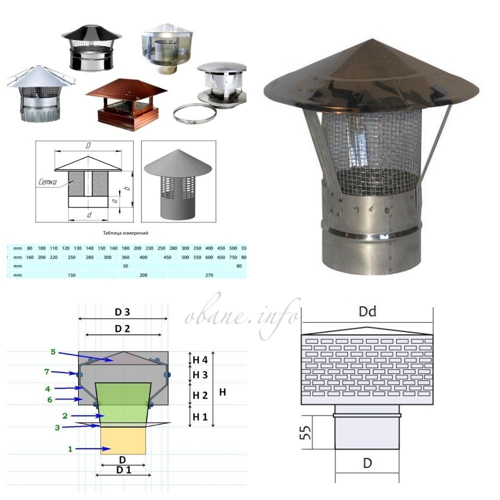 Габариты этих устройств могут быть разными, всё зависит от диаметра дымохода. Диаметр искроулавливателя может быть и 80 мм, и 550 мм. Размер козырька напрямую зависит от диаметра присоединительной трубы, что устанавливается на дымоход. Рассмотрите таблицу, чтобы понять зависимость.