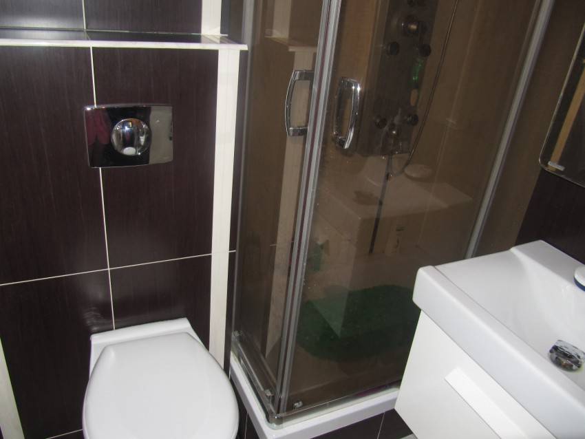Душевая кабина может спасти положение и оставить место для бытовой техники и маленького шкафчика для хранения полотенец, химии и полезных мелочей, ее располагают в углу.
