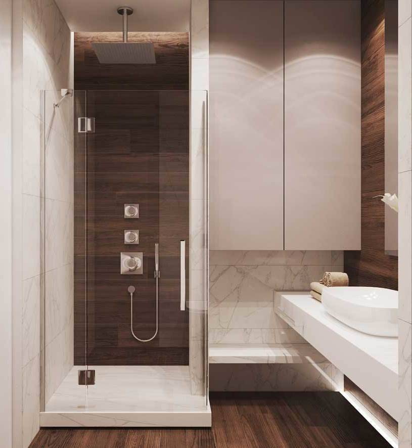 Вместо чаши можно установить душевую кабину и сэкономить место. Освободившуюся площадь используют под бытовую технику, корзины для белья или полки.