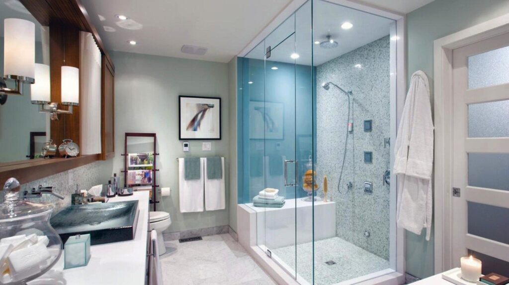 Одним из самых распространённых методов по отделке ванной комнаты – использование стеклянных решений. Это выглядит изысканно, красиво и оригинально. При желании вы можете установить стеклянный резервуар, который будет дополнять стеклянные полочки и использовать другие идеи аксессуаров.