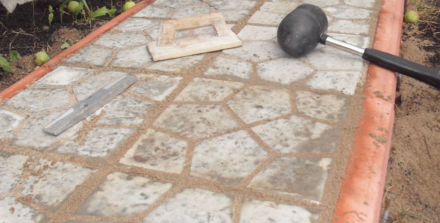В завершение нам остается лишь нанести на выложенную дорожку слой влажного песка и втереть его в стыки