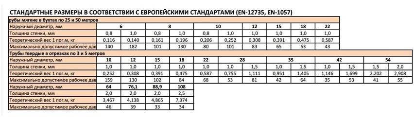 Диаметр и толщина стенки. Рекомендуется использовать трубки диаметром 3/4, 1/4, 1/2, 3/8, 5/8 дюймов. Чтобы подобрать оптимальный диаметр труб для вашего кондиционера, загляните в его техпаспорт. Там указаны рекомендуемые диаметры и другая полезная информация. Оптимальная толщина стенки трубы — не менее 0.6 мм и не более 0.8 мм.