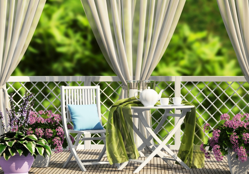 Особое значение придают текстильной составляющей интерьера. Различные материалы применяют для декорирования не только закрытых, но и открытых веранд:
