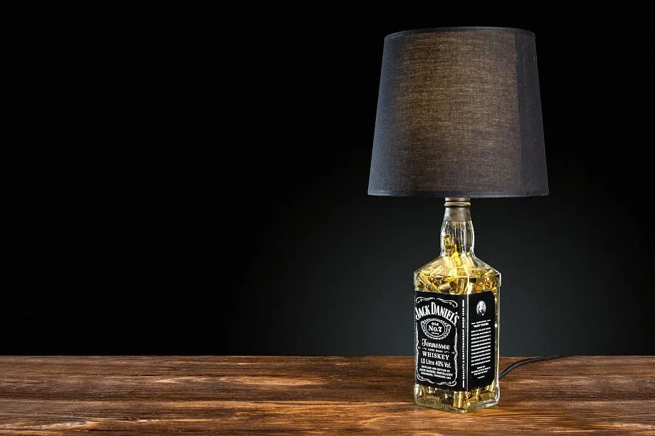 Солидно выглядят люстры из хрустальных бокалов и графинчиков, а также из высоких стаканов с рисунком. Часто лампы изготавливают из винных бутылок. В них размещают гирлянду с мелкими лампочками.