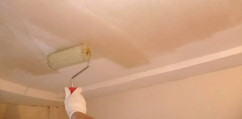 - Умеренно смочить пульверизатором либо валиком небольшую часть поверхности. Вода с потолка не должна капать.