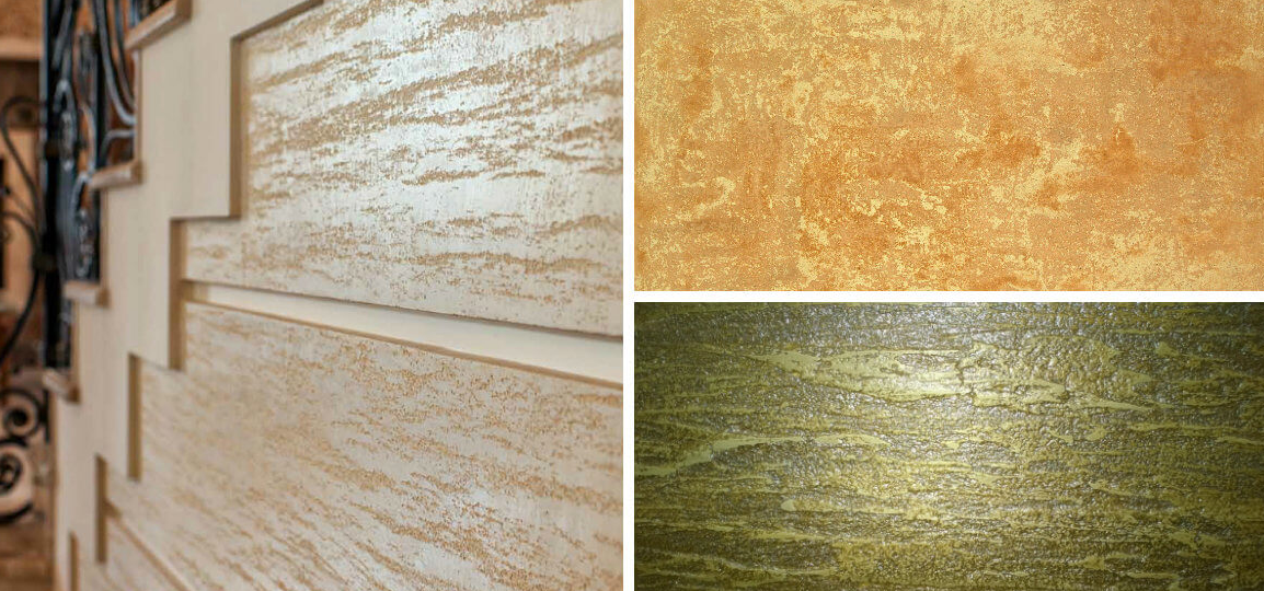 Декоративная штукатурка в имитации золота — это не столько сам состав с определенными ингредиентами, сколько техника нанесения, которая предусматривает колеровку. Поэтому, для того чтобы получить на стене неповторимый эффект, можно использовать один из существующих сегодня видов декоративной штукатурки, это могут быть составы: