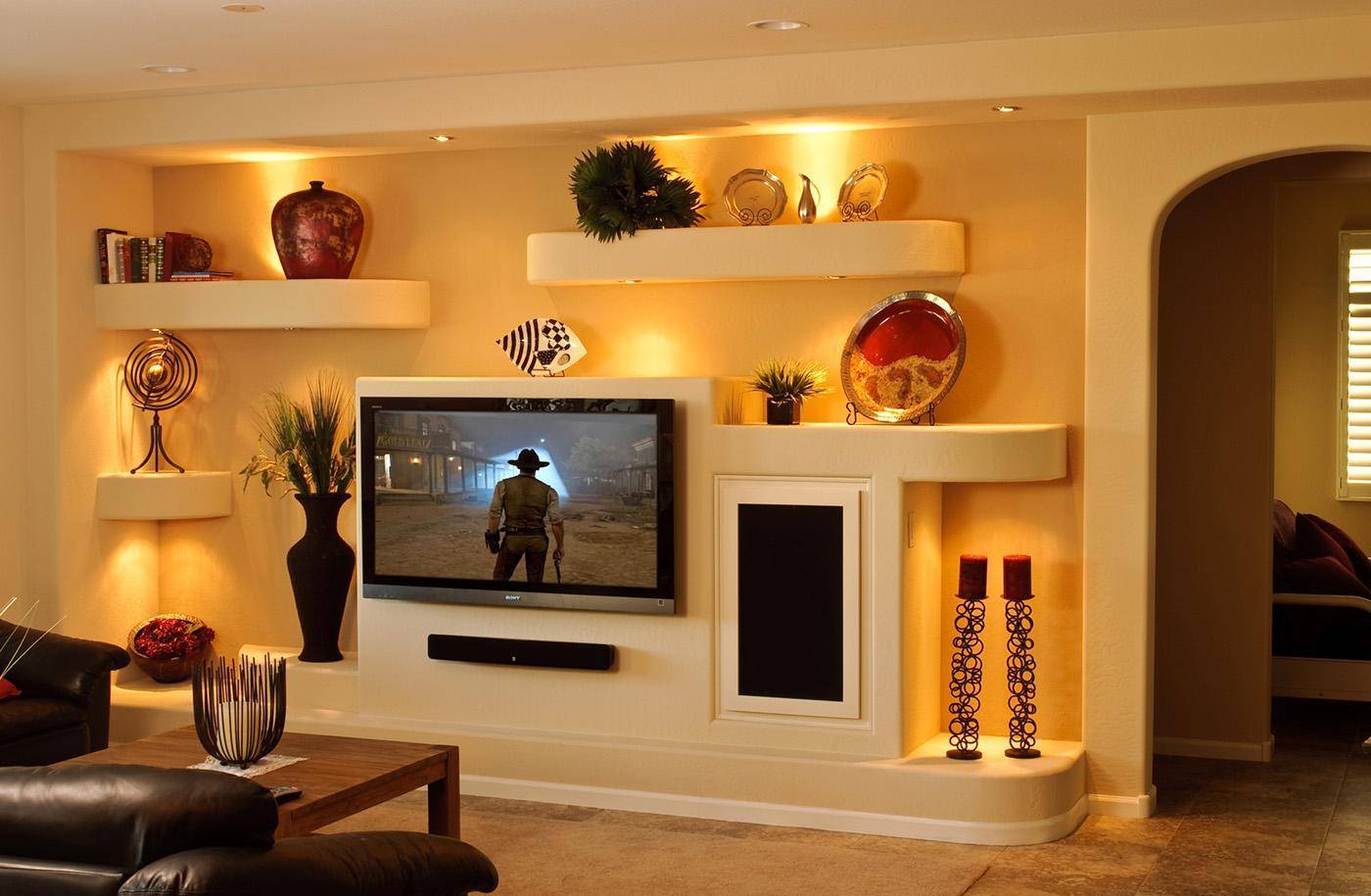 Что хранят в стеновых нишах? В углубления небольшой глубины и размера обычно ставят памятные статуэтки или вазочки, можно разместить в них небольшие книжные полки. Ниши большего размера могут вместить в себя телевизор или картину.