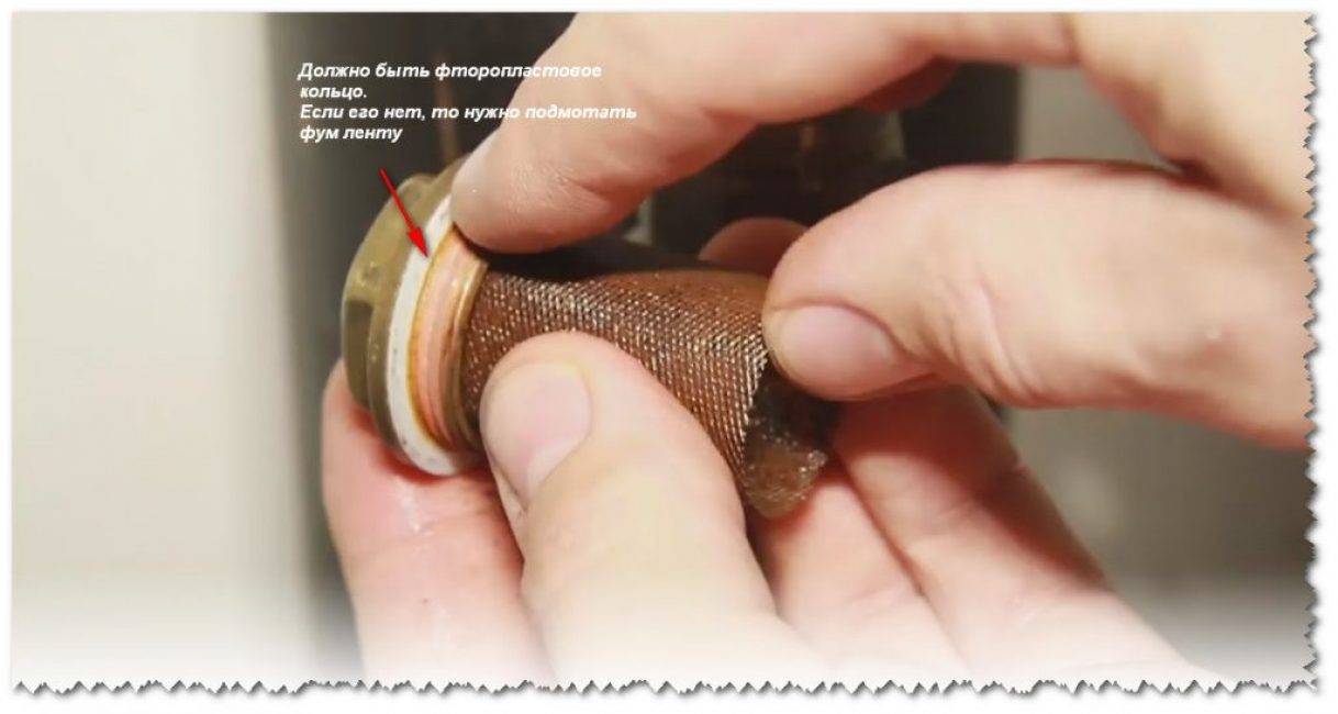 Сборка осуществляется в обратном порядке. Перед монтажом нужно убедиться в том, что уплотнительная прокладка на месте, и что она исправна. Если герметизация нарушена, то можно воспользоваться фум лентой, фум нитью или льном.