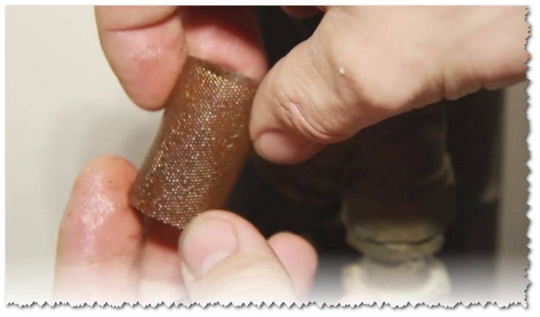 Промывают сетчатый фильтр в воде. Поэтому нужно её заготовить заранее. Фильтр аккуратно сжимают по кругу и промывают водой. Деформировать фильтр нужно легко, чтобы соединительный шов не разошёлся.