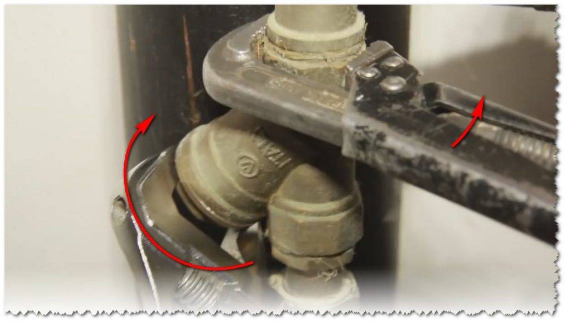 Установив ключи на гайки, как показано на рисунке, основное усилие придаём ключу, откручивающему гайку фильтра, вторым не даём трубе повернуться.