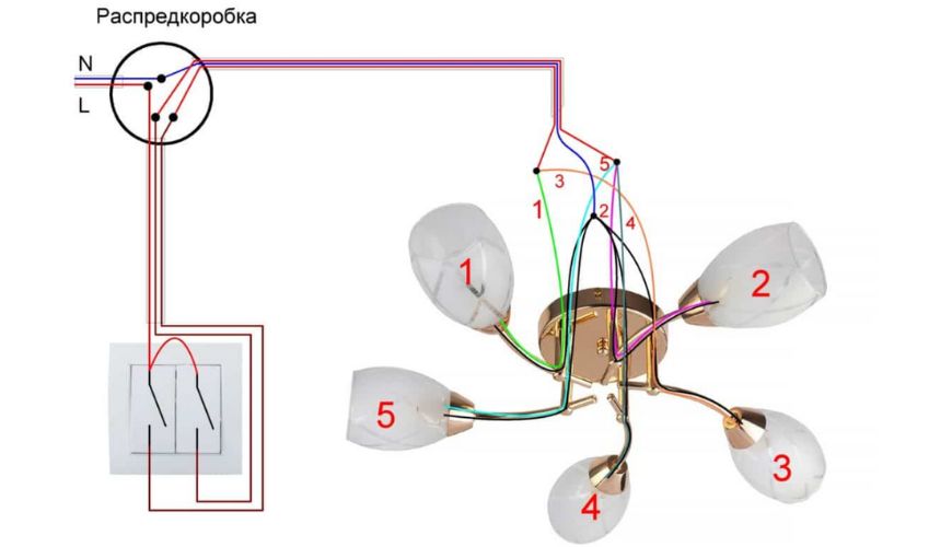 Необходимость подключения к выключателю большего количества проводов может возникнуть, если вы зададитесь вопросом, как собрать люстру с 5 лампами или как подключить трехрожковую люстру к двойному выключателю.