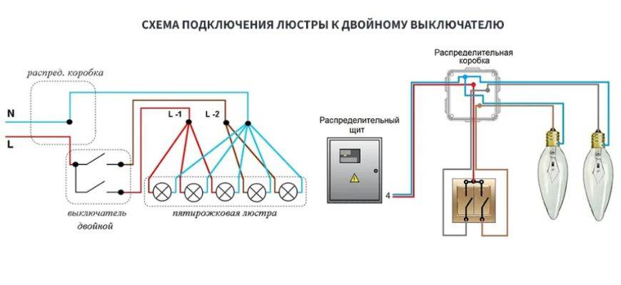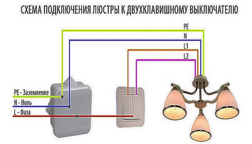 С двойным выключателем работают при таких условиях: наличие трех проводов в потолке (2 фазы и ноль) и такого же количества – в люстре. Сам прибор освещения обычно содержит несколько лампочек. Ноль люстры стыкуют с общим нолём сети, каждую секцию ламп – с фазными проводниками. Все скрутки изолируют, закрывают в клеммной коробке.