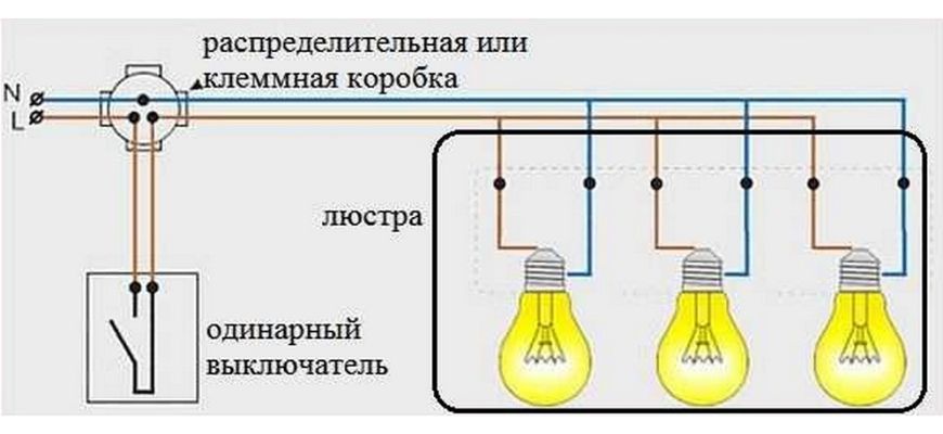 Теперь предположим, что люстра – двухрожковая и подключить ее нужно к одноклавишному выключателю.