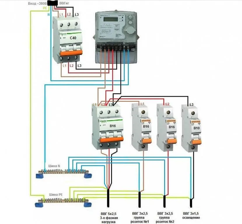 Сперва входная часть оборудуется 40 амперным трехполюсным автоматом. Дальше к нему направляют три жилы: черную, красную и коричневую. Как видно на фото, справа вверху располагается счетчик. Понятно, что он тоже должен быть трехфазным. Синим проводом обозначен ноль. Он тоже подключается к счетчику, после чего идет от выхода из него на специальную шину (N) нуля. Дальше от шины ноль распределяется группе освещения, розеток и фазной нагрузки.