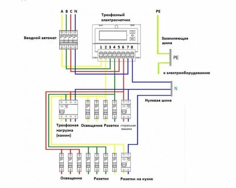 Схема распределения трёх фаз для энергоснабжения коттеджа Источник samelectrik.ru