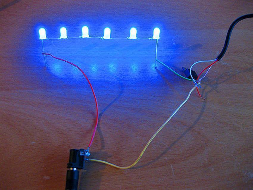 Но будьте осторожны при сборке, поскольку у такой схемы нет ограничения по отдаваемому току. Светодиоды будут отбирать свои положенные полтора ампера, но, если вы коснётесь оголённых проводов рукой, ток достигнет десятка ампер, а такой удар тока очень ощутимый.