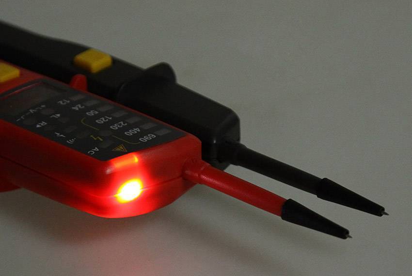 Для этого переключатель цифрового тестера переводят в положение «проверка на обрыв» и щупами поочерёдно касаются выводов светодиода. У исправного элемента в прямом смещении будет наблюдаться небольшое свечение кристалла. Таким образом, можно сделать вывод не только о цвете свечения, но и о работоспособности полупроводникового прибора.
