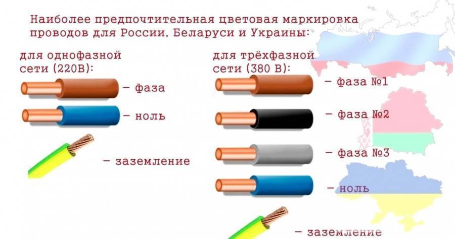 - Первый – это фазный провод, может иметь любую расцветку. Место его подключения на электрооборудовании обычно обозначают «L».