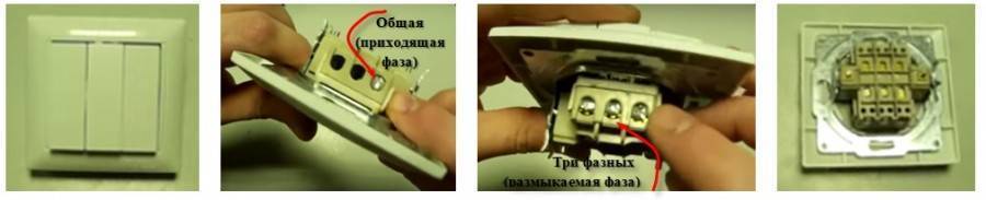 На тройном выключателе предусмотрено 4 контакта, 3 из которых идут на лампы и один на питающий провод сети рисунок 3. Далее вставляем и прикручиваем фазу во входное крепление, а провода, идущие к лампочкам в остальные 3 крепления, надежно устанавливаем выключатель в стену или стакан, после чего собираем сам корпус.