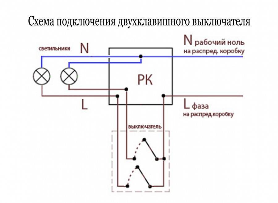 Двухклавишный выключатель представляет собой 2 одиночных ключа, собранных в одном корпусе. Нулевой и заземляющий провода подходят к секциям напрямую, а фаза проходит через выключатель.