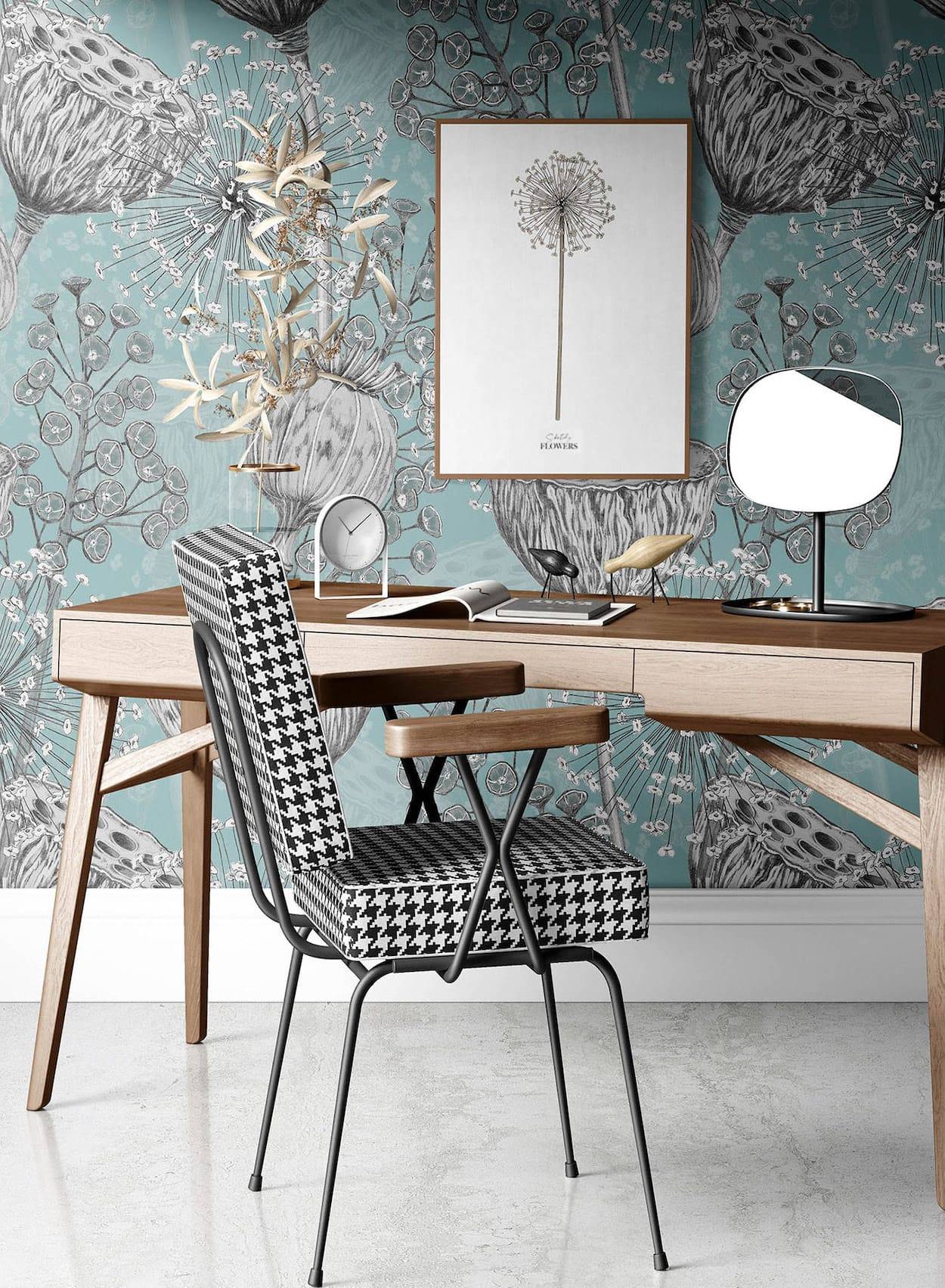 - Модно сочетание обоев с принтом с однотонными, без какого-либо орнамента. В этом случае они должны быть одного цвета, чтобы не заглушать друг друга и не конфликтовать между собой. Тогда для первого вида стоит выбрать ту область стен, которая будет центральной. К примеру, наклеить обои с принтом на стену в изголовье кровати, а противоположную оформить однотонными, но того же цвета.