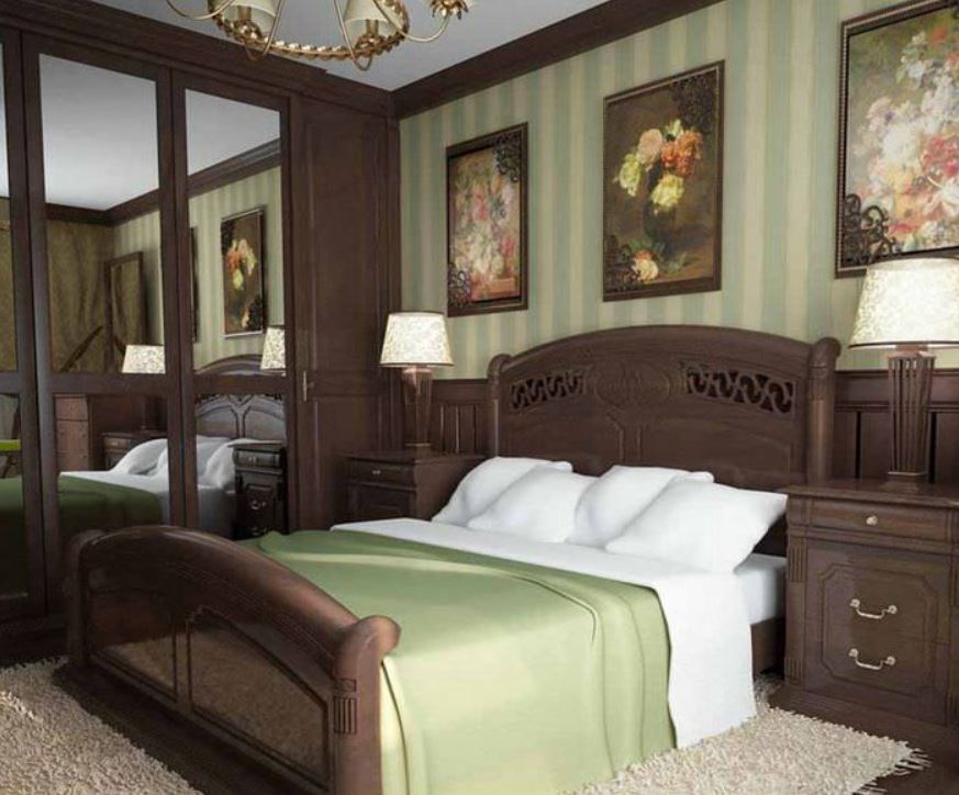 Коричневая мебель – это классические древесные оттенки, которые впишутся в любое цветовое решение в зависимости от насыщенности. Идеальные компаньоны коричневой мебели – бежевая, золотистая и голубая отделка стен, а также обои в розовом, бордовом и зеленом цвете.