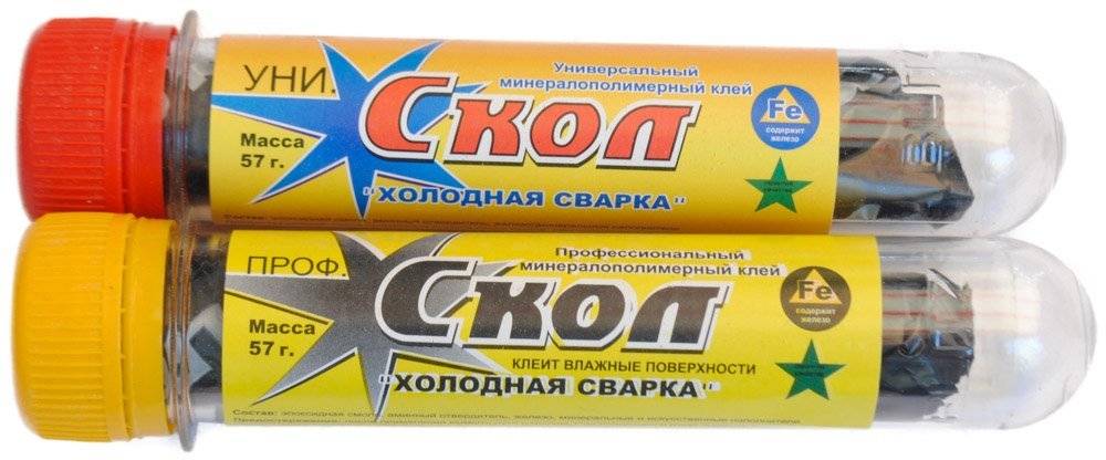 Фирмы-производители выпускают холодную сварку в цилиндрической емкости, сама масса состоит из двух слоев. Эпоксидная смола находится во внутренней части, в нее добавлены мельчайшие частички металла, а сверху -отвердитель. Добавление металлической пыли придает сварному шву высокую прочность, делает его намного надежнее.