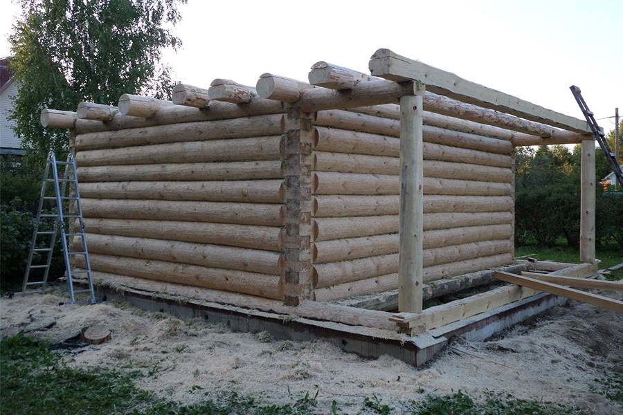 Недостаток: появление слишком больших щелей между фундаментом и бревнами, которые необходимо заделывать брусками, кирпичом или частицами бревна. Как вариант, можно залить фундамент, с разным уровнем перпендикулярных сторон.