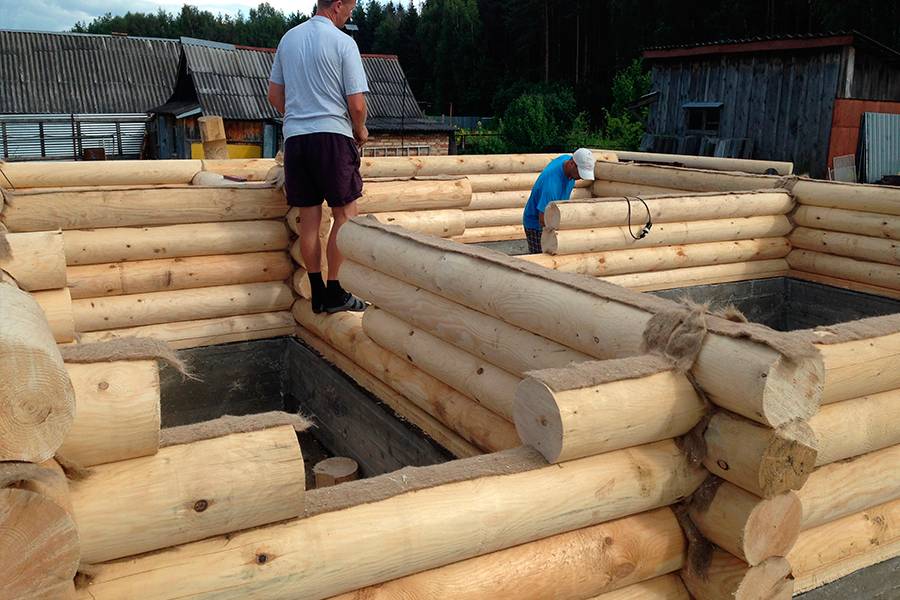 - Первый способ. Два бревна кладут на фундамент параллельно друг другу, предварительно стесав с каждого по 4-5 см для плотного прилегания. Между бревном и гидроизоляцией прокладывают утеплитель – это может быть пакля, джут или мох. На две свободные стороны также параллельно друг другу выкладывают еще два бревна, укрепив их на первых стесанных бревнах.