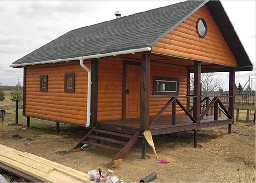доска, пропитанная антигрибковым раствором. При желании монтируются дождевые отливы по периметру крыши и сточные трубы к земле.