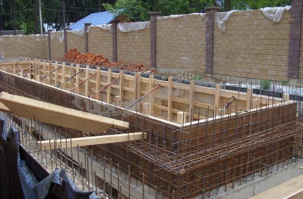 - Установка опалубки для стен, сборка арматурного каркаса и установка его внутрь опалубки.