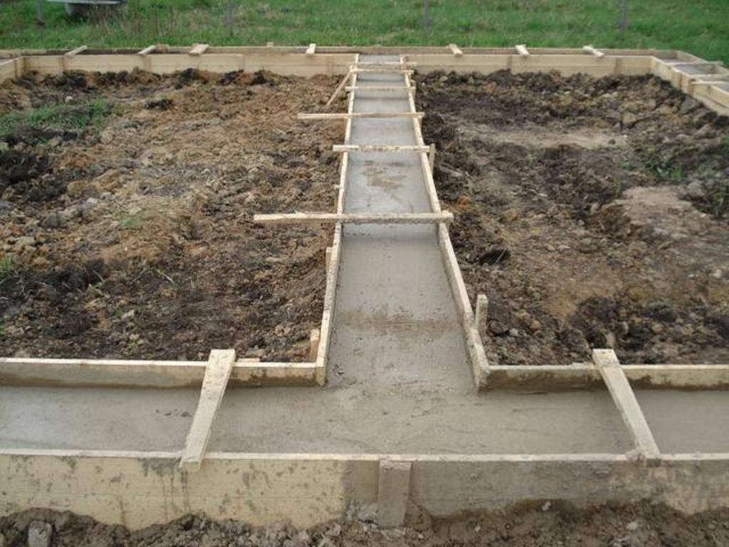 - Заливка фундамента. Если особенности почвы позволяют, то будет достаточно выполнить фундамент глубиной до 0,8 м.