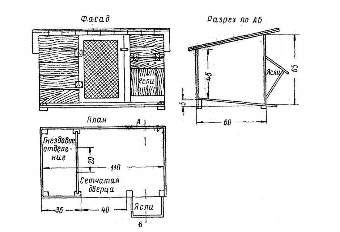 - Готовый каркас дополнительно обшивают фанерой, досками или любым другим используемым материалом. Полученное пространство внутри делится на секции кормовые и гнездовые при помощи перегородок. Дополнительно в перегородке проделывается отверстие диаметром приблизительно 20 см. Чтобы животные не грызли перегородку, рекомендуется отверстие дополнительно обить отверстие жестью.