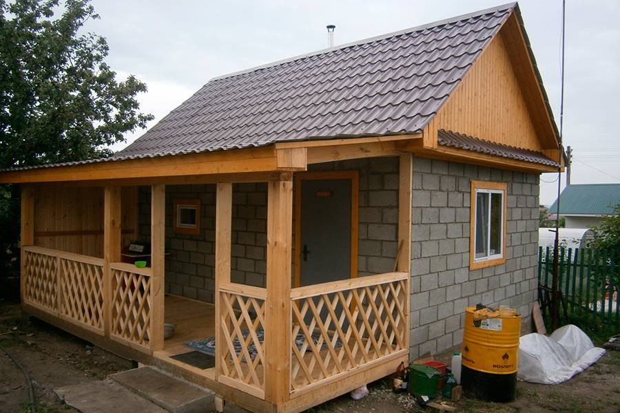 Каркасная баня с верандой (сборно-щитовая) – бюджетный вариант для ограниченного пространства, который не требует фундамента и значительного времени на возведениеИсточник domodel.org