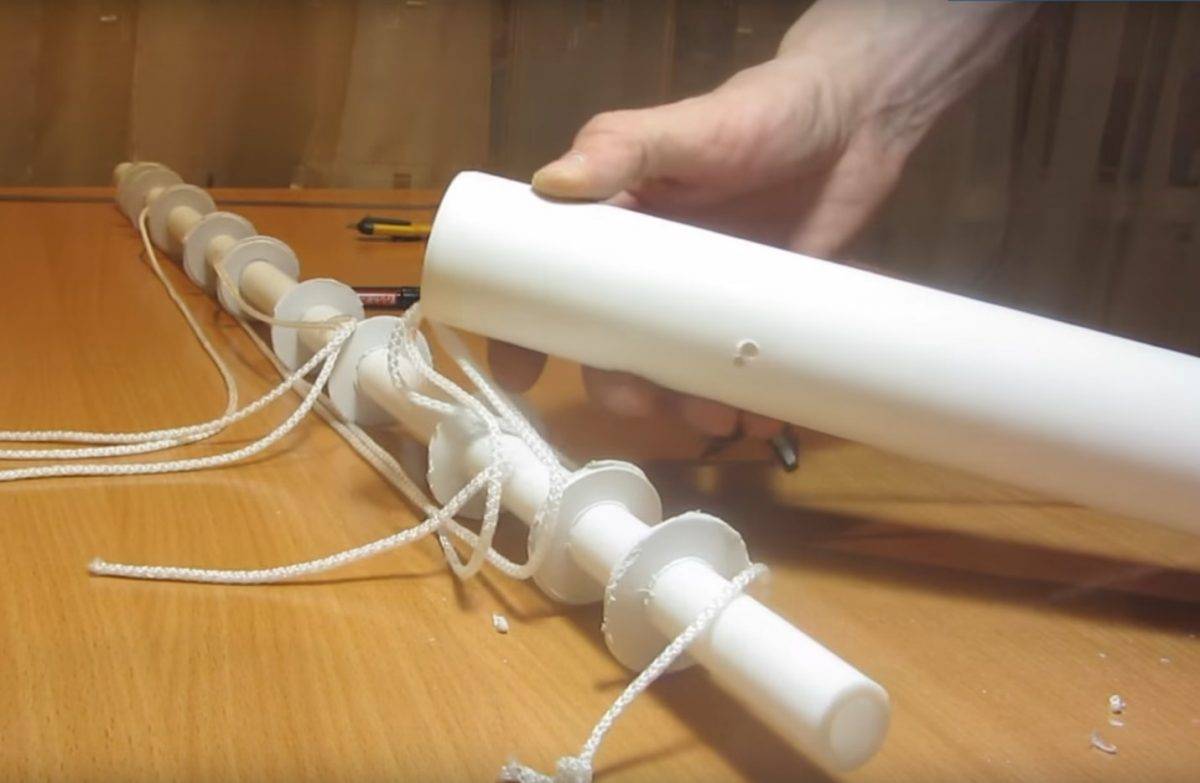 Теперь можно приступать к подвешиванию стержней. Для этого нужно веревку нарезать на равные отрезки и закрепить их на торце стержней пока с одной стороны. Свободный конец веревки нужно пропустить через роликовый механизм левого кронштейна, закрепить шнур на другом торце стержня, и протянуть петлю из двух шнуров через правый кронштейн. Затем следует закрепить на веревке фиксаторы и, отмерив необходимую длину, подрезать ненужный край.