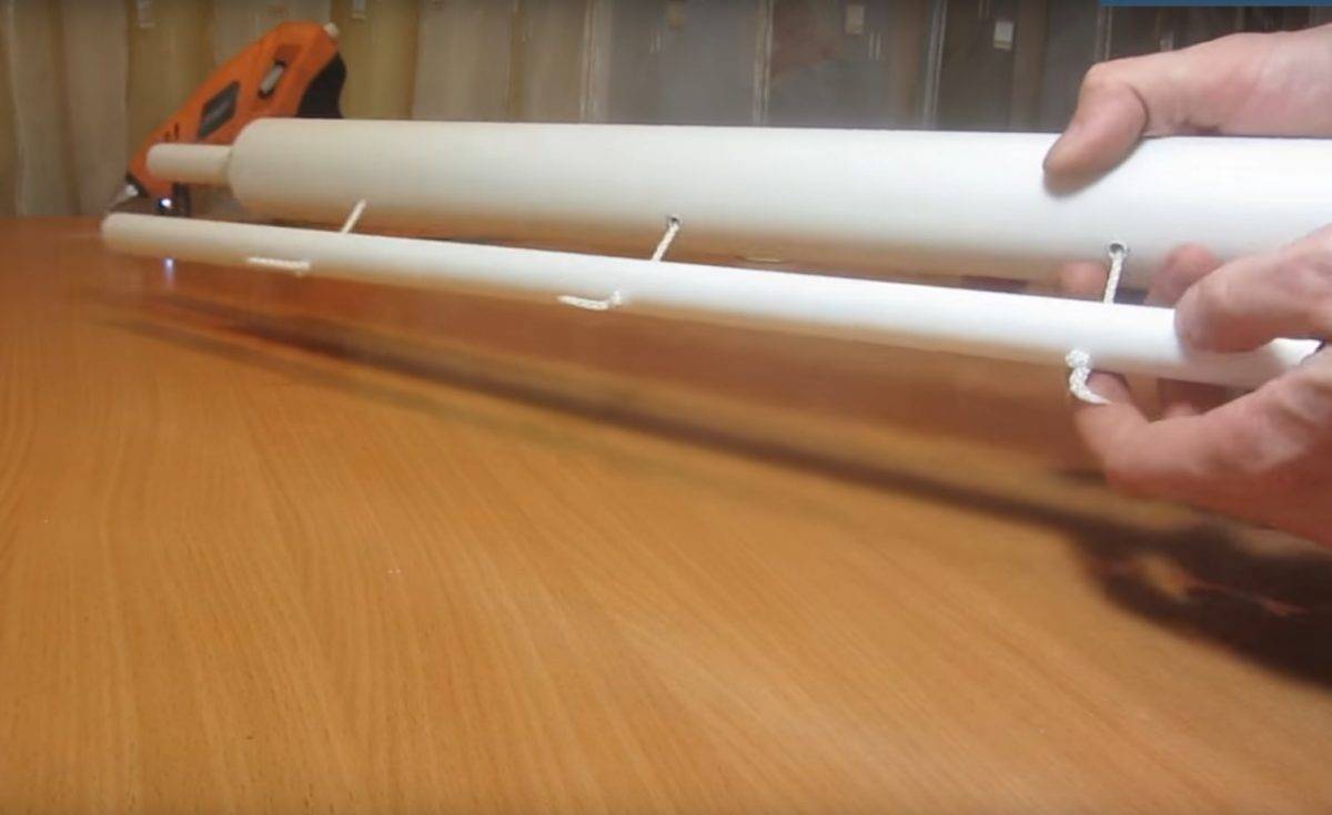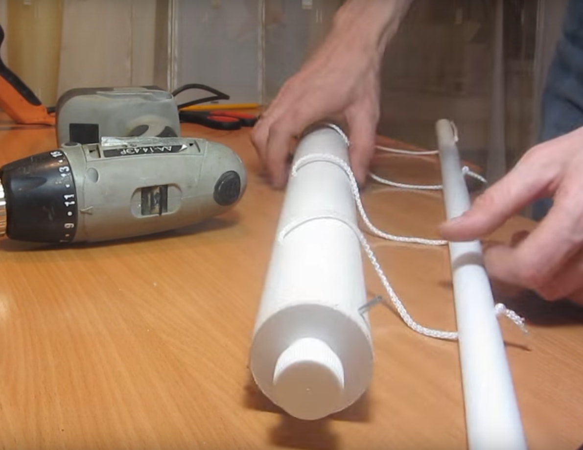 ![]() | Затем на трубу наматывается необходимое количество веревки. Свободные концы остаются снаружи. К ним схожим образом прикрепляется малая труба, играющая роль второй планки. |
