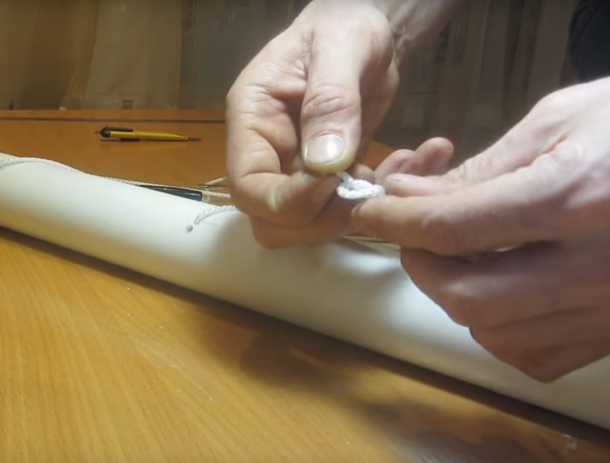 - Распутайте шнуры, завяжите на конце каждого узелок, прикрепите каждый на отдельную штангу. Для этого вставьте шнур в паз и затяните так, чтобы утопить узелок.