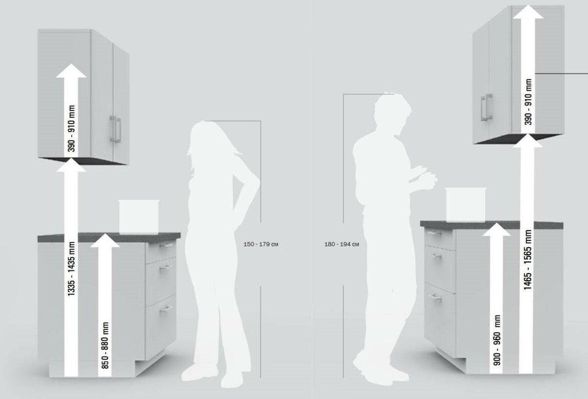 - Если вы не планируете монтировать столешницу или низ гарнитуры, соотношение роста человека к высоте застежек должно выглядеть так: