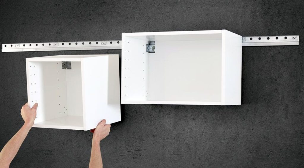 У монтажной рейки есть свои «минусы». Эта система крепления навесных шкафов быстро изнашивается при слишком большой нагрузке. Чтобы этого не произошло, нужно выбирать более дорогостоящую и толстую планку. Данная конструкция не позволяет шкафчикам плотно прилегать к стене. Зато подвешенную мебель можно быстро и легко снять в любой момент. По завершению работ навешиваются фасады, прикрепляются двери, устанавливаются полки.
