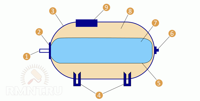 Устройство гидроаккумулятора: 1 — резьбовой присоединительный патрубок; 2 — фланец; 3 — корпус; 4 — опорные ножки; 5 — эластичная мембрана; 6 — воздушный клапан; 7 — вода; 8 — сжатый воздух; 9 — несущая плита для насоса