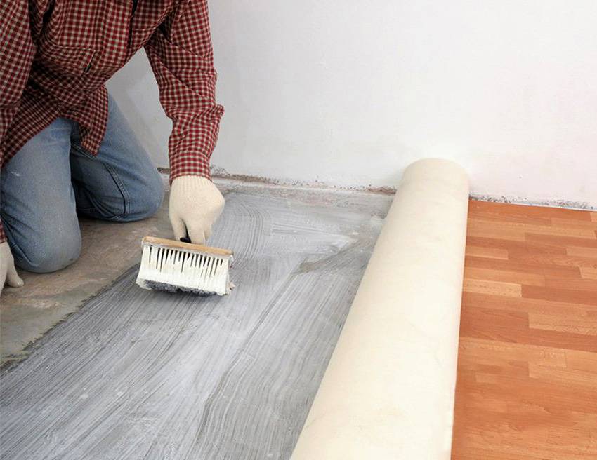 Сначала клей наносят на черновой пол, а только по истечении 15 минут на линолеум