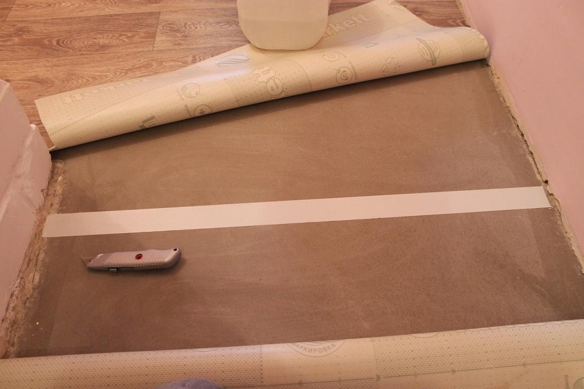 Несложный способ, который подойдет для любых помещений. Лучше всего приобрести качественный скотч от фирмы 3М или аналоги со схожими характеристиками. При проведении работы нужно отогнуть одну половину покрытия и на пол наклеить скотч в виде решетки со стороной не более 50 см.