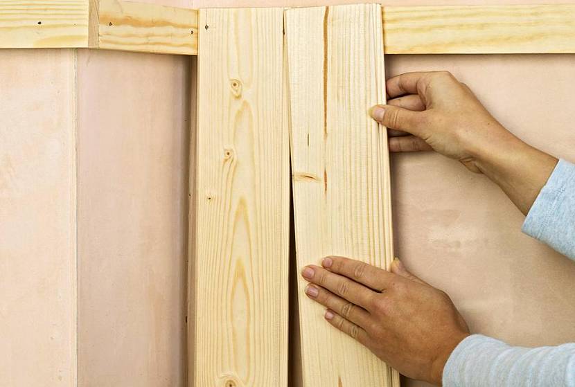 Если стена неровная, то под обрешетку надо что-то подкладывать (либо брать обрешетку большей толщины). В качестве подкладки обычно берут монтажный клин, кусок деревянного бруса или фанеру. Обрешетка закрепляется саморезами большой длины дюбель-гвоздями. Нижние рейки отстоят от пола на 5 см, поскольку внизу будет крепится напольный плинтус, а верхние — на столько же от потолка.