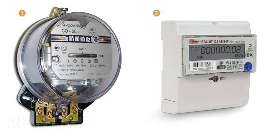 1 — индукционный (дисковый) электросчётчик; 2 — электронный электросчетчик
