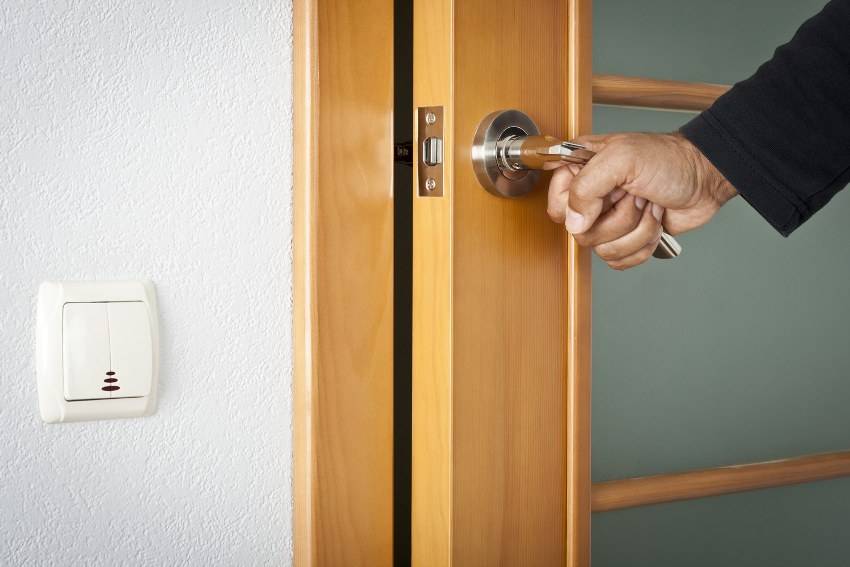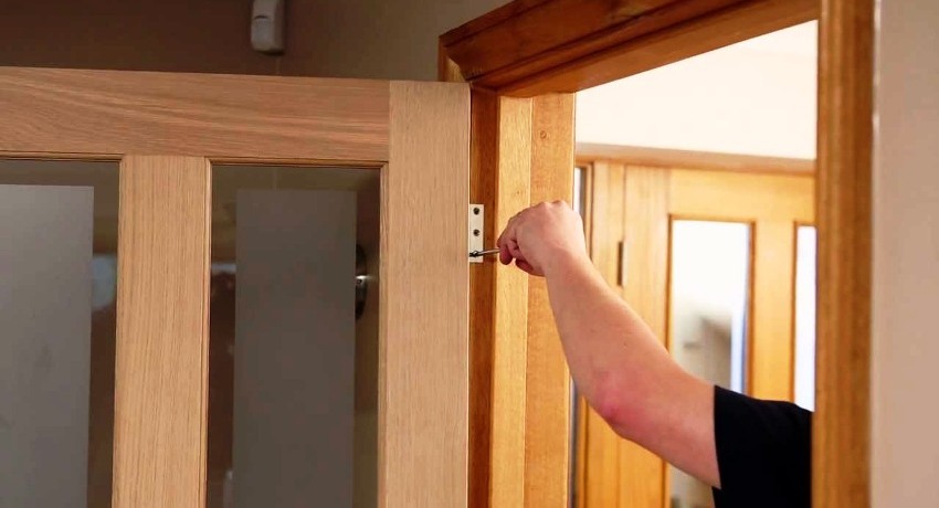 - После монтажа дверной коробки полотно навешивается на петли для проверки правильности установки. Дверная ручка с замком для межкомнатных дверей устанавливается в последнюю очередь.