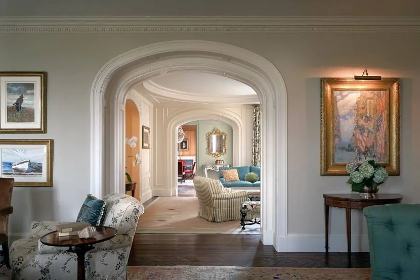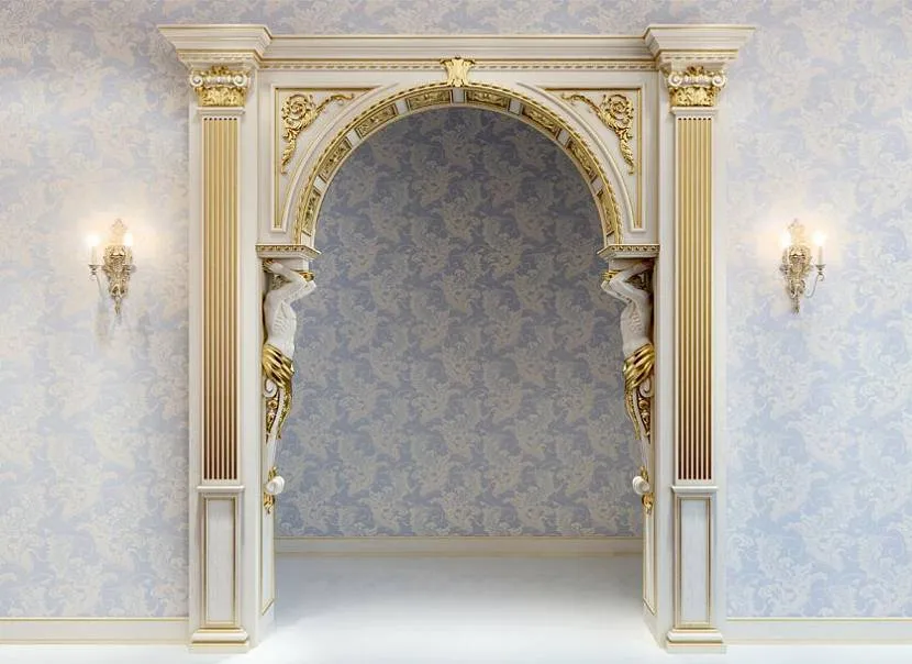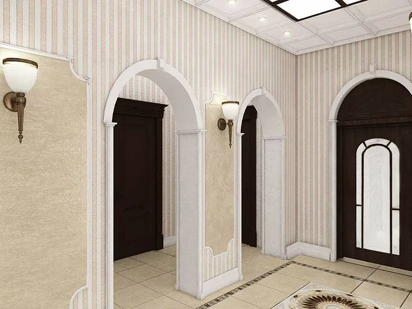 Классический интерьер украсит арка с правильными симметричными формами. Отделка может быть выполнена из гипса, дерева или пластиковых панелей. Не лишними будут элегантные декоративные детали, например лепнина. Но их должно быть не много, лишь в виде изящного дополнения.
