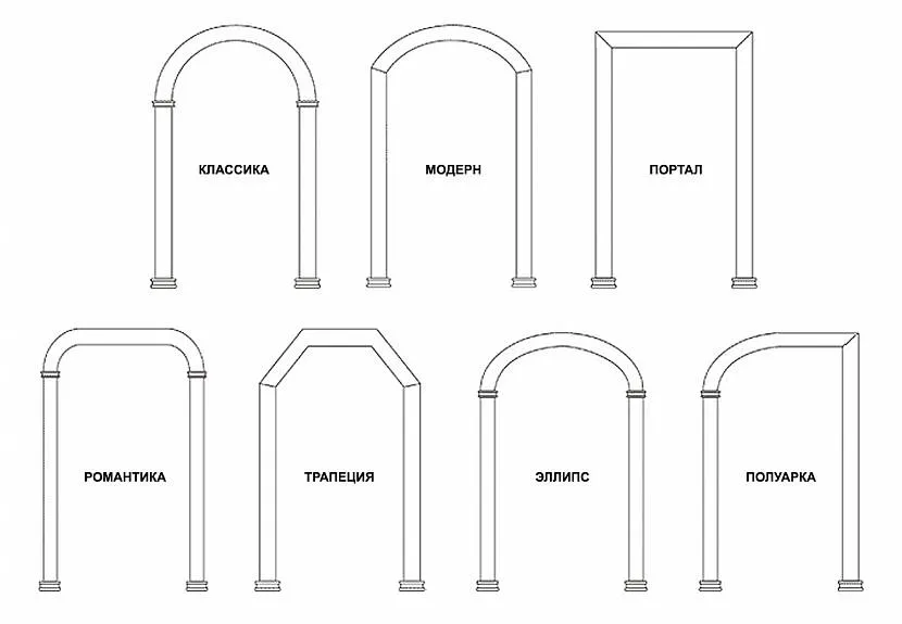 Арочная система может быть выполнена из бетонного монолита, кирпича, дерева, металла, пластика. Также их можно изготовить из ДСП, ГКЛ, ДВП, фанеры и т.д.