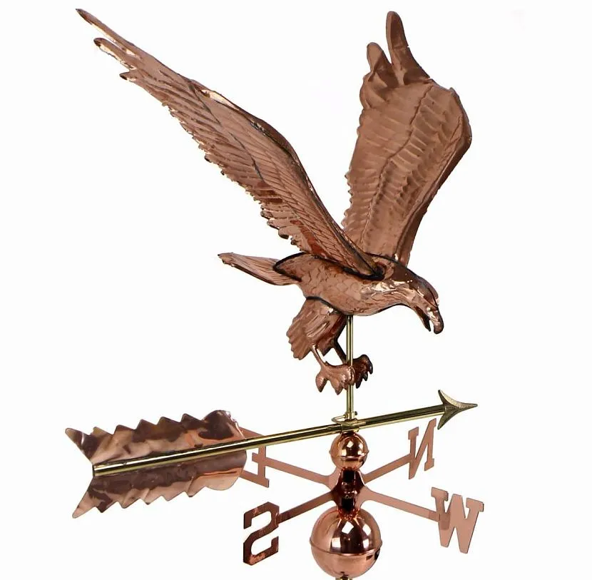 Стойкий, прочный и пластичный металл выдерживает перепады температуры, влажность и яркое солнце. У меди естественная устойчивость к коррозии, поэтому в домашних условиях конструкцию не нужно дополнительно защищать. Флюгер из практичного материала «стареет», приобретая дорогой, красивый вид.