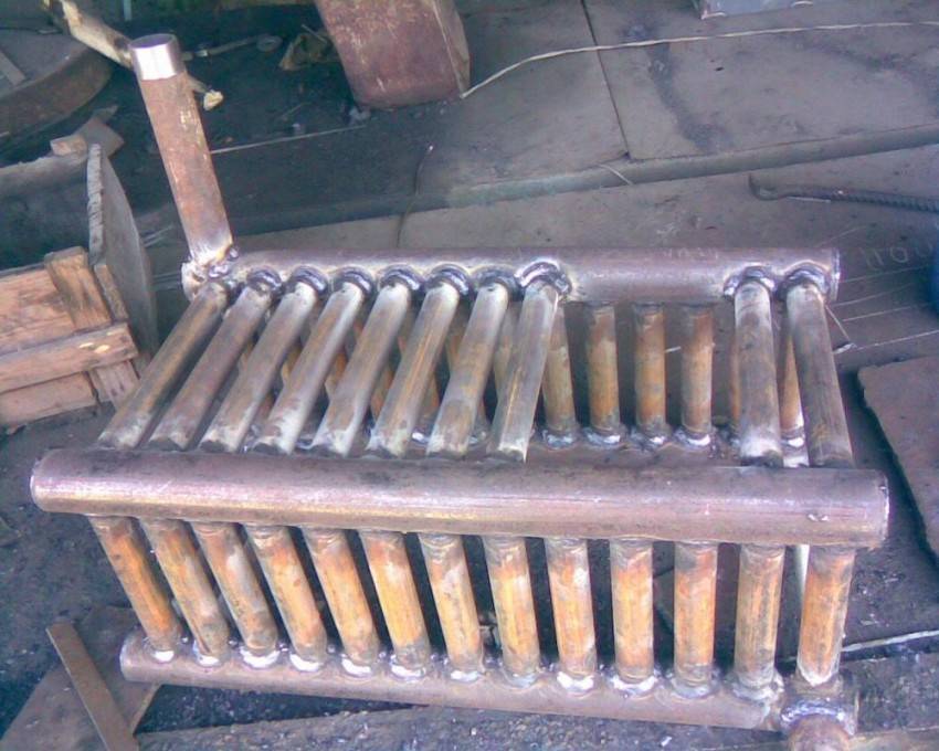 Следующий этап касается топочной камеры. С обратной стороны от дымохода внутрь корпуса вставляется готовая решетка из арматуры.