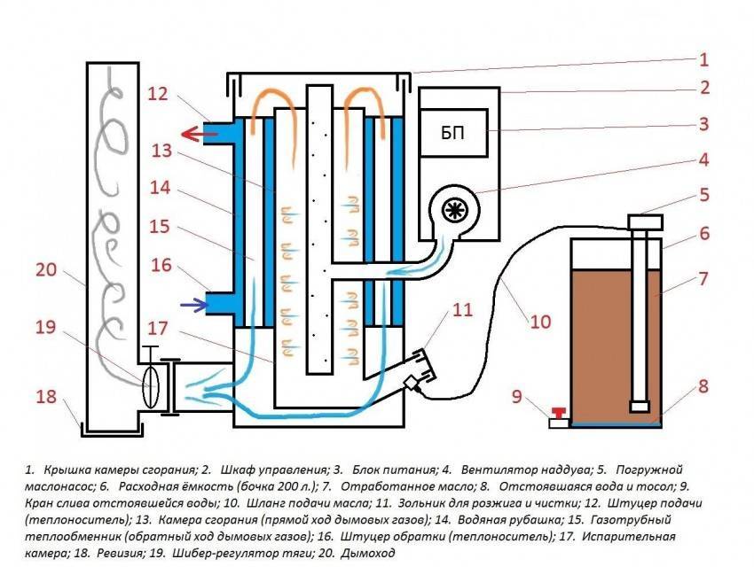В котлах, работающих на отработанном масле, можно использовать и солярку в качестве топлива. Принцип их работы следующий: масло капает на раскаленный поддон и испаряется, трансформируясь в газы, а те, сгорая, подогревают теплоноситель.